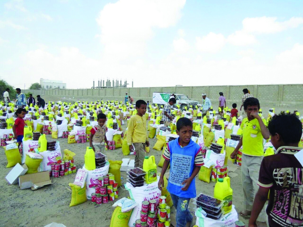 أطفال يمنيون يستلمون مساعدات غذائية من إحدى الحملات الإغاثية السعودية. (عكاظ)