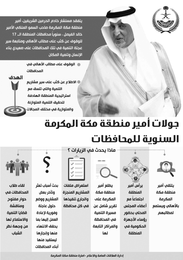 ويطلع أمير منطقة مكة المكرمة خلال الجولة على مشاريع التنمية في المحافظات ويستقبل الأهالي ويستمع إلى مطالبهم، بحضور مديري الأجهزة الحكومية، كما يرأس اجتماع المجلس المحلي.