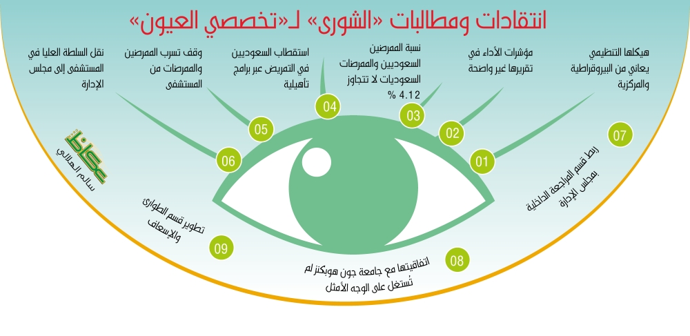 وجه أعضاء في مجلس الشورى أمس (الإثنين) انتقادات لتقرير مستشفى الملك خالد التخصصي للعيون، وأكدوا أن «مؤشرات الأداء التي تضمنها التقرير غير واضحة، وأن الهيكل التنظيمي للمستشفى يعاني من البيروقراطية والمركزية».