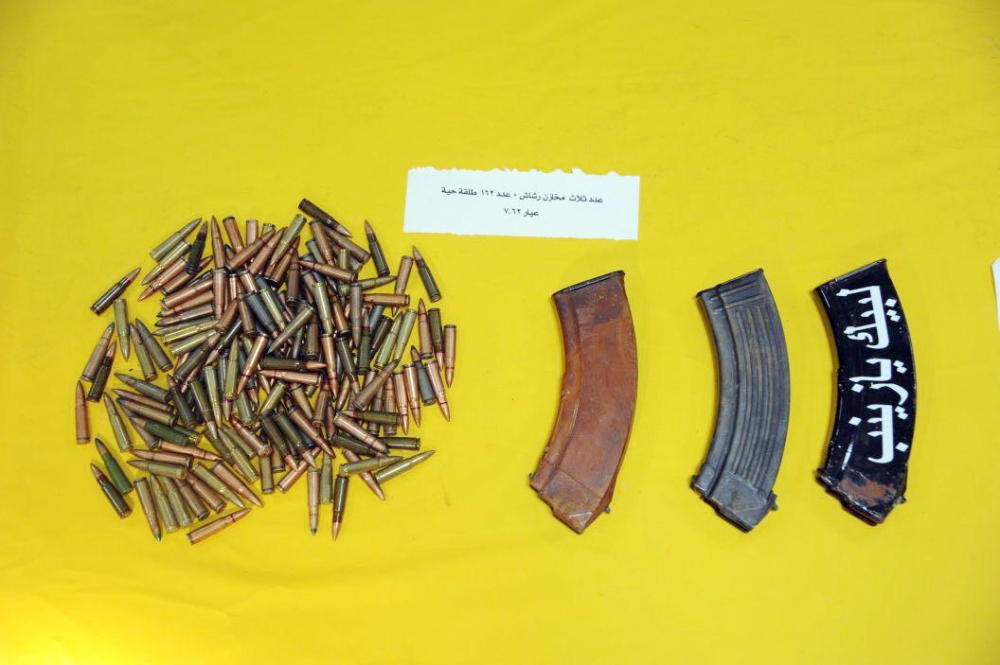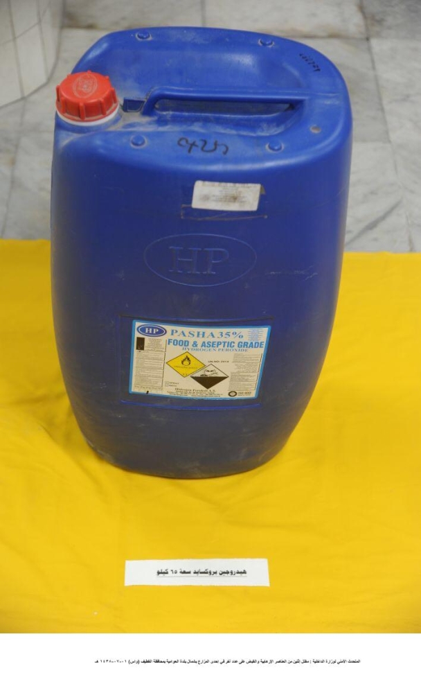 وأشارت إلى أنه بتفتيش المزرعتين تم العثور على (130) جالوناً من مادة الأسيد الحارقة، وكمية من مادة تستخدم في تصنيع المواد المتفجرة، وجالون من مادة البوتاسيوم، وثلاثة مخازن لسلاح رشاش، و71 طلقة حية، وقناع أسود اللون.