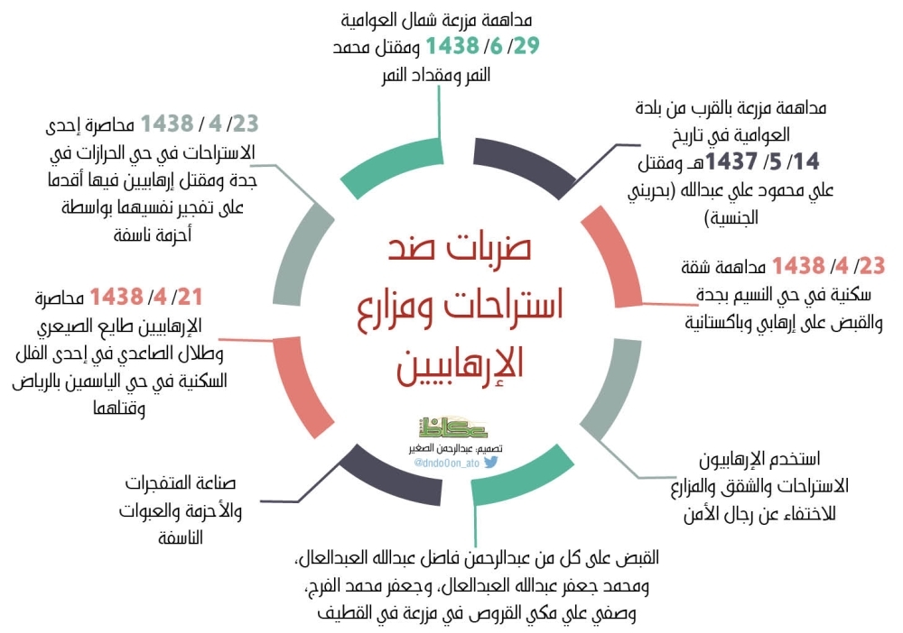 واصلت الأجهزة الأمنية في تعقب إرهابيي داعش، وتمكنت من تسجيل نجاحات كبيرة ومتوالية في كشف أوكارهم التي حرصوا أن تكون في بعض الأحيان في استراحات بعيدة عن الأحياء السكنية أو التخفي في شقق سكنية وفلل في أحياء مأهولة، كما حدث في جدة والرياض، إذ باشرت الجهات الأمنية في 23/ 4 / 1438هـ مداهمة وكرين لخلية إرهابية بشكل متزامن. الأول بحي الحرازات، وهو عبارة عن استراحة، اتخذها عناصر الإجرام مأوى لهم، ومعملا لتصنيع الأحزمة الناسفة والعبوات المتفجرة. وبتطويقها وتأمين المواقع المجاورة لها بادر من فيها -وهما شخصان- بإطلاق النار على رجال الأمن، ولم يستجيبا لكل النداءات التي وجهت لهما بتسليم نفسيهما، ما اقتضى الرد عليهما بالمثل وفقا لما تطلبه الموقف. وحينما يئسا من القدرة على الإفلات من قبضة رجال الأمن أقدما على تفجير نفسيهما بواسطة أحزمة ناسفة ما أدى لتطاير أشلائهما في موقع الاستراحة مع انفجار المعمل الذي بداخلها، فيما لم يصب أحد من الموجودين بجوار موقعها الذي تم تأمينه قبل المداهمة أو أحد من المارة أو رجال الأمن بأي أذى. أما الوكر الثاني فكان عبارة عن شقة سكنية بحي النسيم بمحافظة جدة، وجد فيها شخص ثالث يرتبط بمن تم التعامل معهما داخل الاستراحة، وتمكنت قوات الأمن من إلقاء القبض عليه قبل أن يتمكن من المقاومة ويدعى حسام بن صالح بن سمران الجهني سعودي الجنسية، وقبض بمعيته على امرأة تدعى فاطمة رمضان بالوشي علي مراد (باكستانية الجنسية) يدعي أنها زوجته. كما ضبط بشقته على سلاح رشاش وحقيبة مشركة وأجهزة هاتف جوال في حالة تشريك غير مكتملة. فيما تمكنت الجهات الأمنية من رصد وجود المطلوب الخطر طايع بن سالم بن يسلم الصيعري - سعودي الجنسية، المعلن عنه في 21 / 4 / 1437هـ لدوره الخطير في تصنيع أحزمة ناسفة نفذت بها عدد من الجرائم الإرهابية، مختبئاً في منزل يقع بحي الياسمين شمال مدينة الرياض ومعه شخص آخر ظهر أنه يدعى طلال بن سمران الصاعدي - سعودي الجنسية واتخاذهما من ذلك المنزل وكراً إرهابياً لتصنيع المواد المتفجرة من أحزمة وعبوات ناسفة، ونتج عن ذلك مقتلهما.