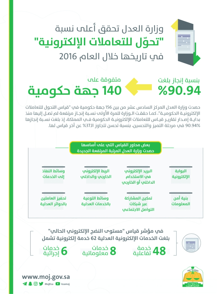 احتلت وزارة العدل المركز السادس عشر بين 156 جهة حكومية في «قياس التحول للتعاملات الإلكترونية الحكومية» في السعودية، في وقت حققت نسبة إنجاز 90.94% في مرحلة التميز والتحسين وهي نسبة مرتفعة وصلت إليها للمرة الأولى منذ بداية إصدار تقارير قياس، بنسبة تحسن تتجاوز 37% عن آخر قياس لها.