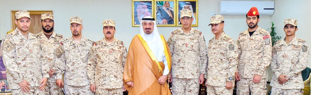 الأمير جلوي بن عبدالعزيز متوسطاً قائد وأركانات لواء الأمير تركي الأول بن عبدالعزيز الآلي بالحرس الوطني أمس. (عكاظ)