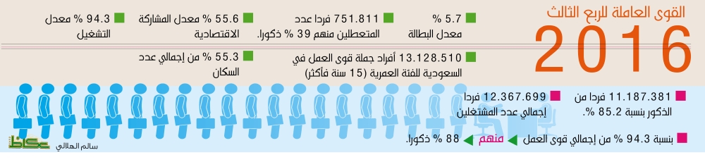 وكانت الهيئة العامة للإحصاء السعودية أعلنت أن معدل البطالة للربع الثالث من العام الماضي بلغ 5.7%، وعدد المتعطلين بلغ 751.811 فردا منهم 39% ذكورا.