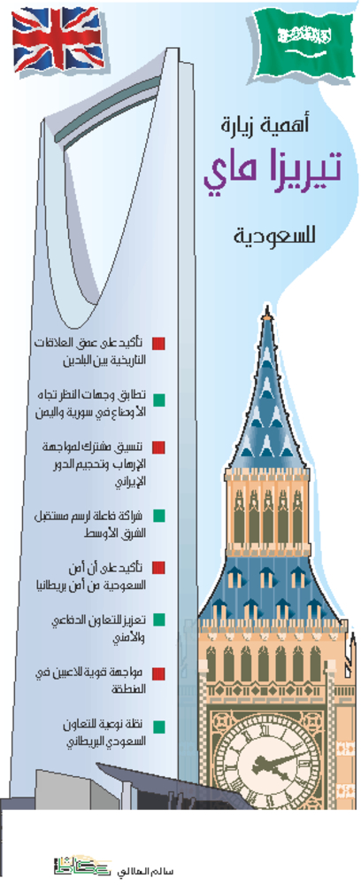 تأتي زيارة رئيسة الوزراء البريطانية تيريزا ماي للمملكة ولقاؤها خادم الحرمين الشريفين الملك سلمان بن عبدالعزيز أمس (الثلاثاء) في الرياض، بعد حراك سياسي تمثل في اتصالات وزيارات تمهيدية بين عدد من المسؤولين، لتؤكد على عمق العلاقات التاريخية بين البلدين، وتطابق وجهات النظر فيما يتعلق بعدد من القضايا وفي مقدمتها الأوضاع في سورية واليمن، ومواجهة الإرهاب، وتحجيم الدور الإيراني وتدخلاته السافرة في الشؤون الداخلية لدول مجلس التعاون الخليجي، والرغبة الجادة في أن تكون بريطانيا شريكاً فاعلاً لرسم خريطة مستقبل الشرق الأوسط أمنياً وسياسياً واقتصادياً.