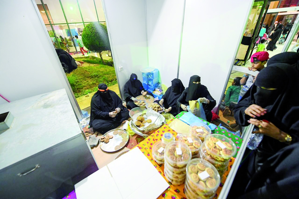 أم وحيد تتوسط سيدات عصاميات يصنعن الكليجا في مهرجان بريدة. (عكاظ)