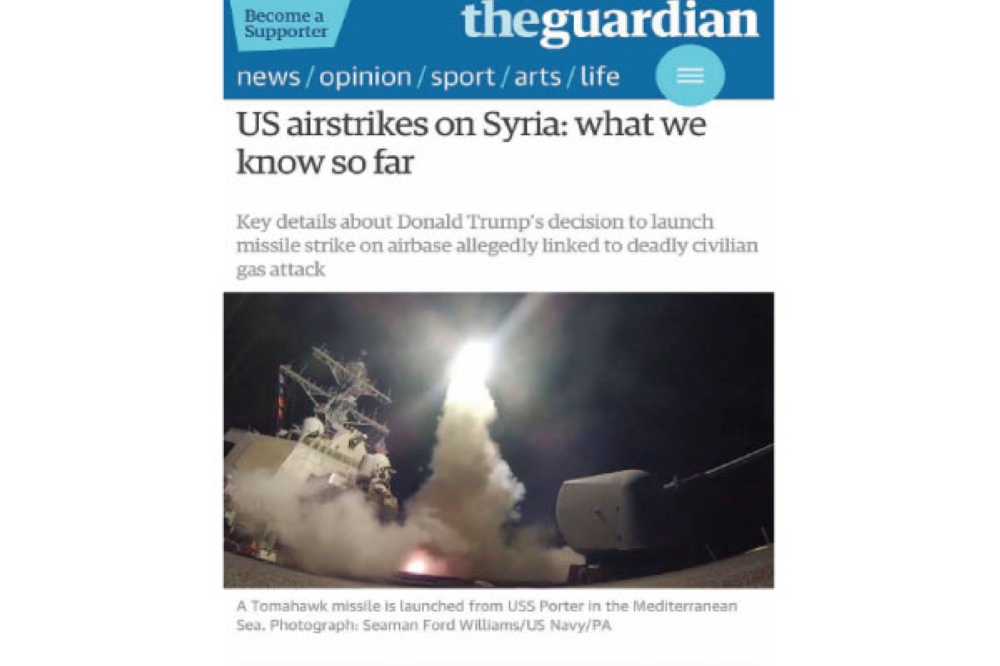 واستهلت صحيفة «غارديان» البريطانية تقريرها بقرار الرئيس ترمب بضرب القاعدة موضحة أن الصورايخ استهدفت قاعدة الشعيرات. من ناحيتها أفردت «بي بي سي» تقريراً لها حول ردة الفعل الدولية تجاه الضربة الأمريكية، وقالت إنه حدث تباين في تصريحات الدول، إذ اعتبر النظام السوري الضربة الأمريكية سلوكاً غير مسؤول من جهته، ووصف ديمتري بيسكوف المتحدث باسم الرئيس الروسي بوتين أن الضربات الجوية الأمريكية عمل عدواني وانتهاك للسيادة السورية. وأعربت الحكومة البريطانية عن كامل دعمها للضربة الأمريكية وأنها تعمل مع الحكومة الأمريكية بشكل مباشر. وقال رئيس الاتحاد الأوروبي دونالد تسك إن أمريكا أشعرت الاتحاد الأوروبي بالضربة وإنها ستكون محدودة وتمنع أي هجوم كيماوي قد يحدث مستقبلاً.