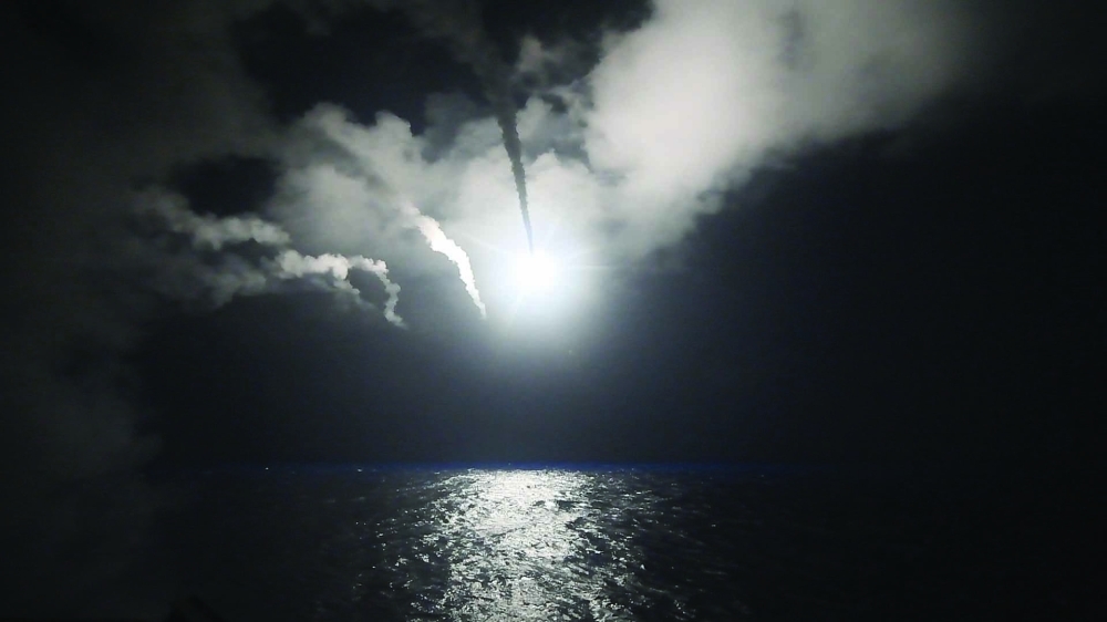 صاروخ «توماهوك» لحظة إطلاقة من إحدى البوارج الأمريكية البحرية. (أ. ف. ب)