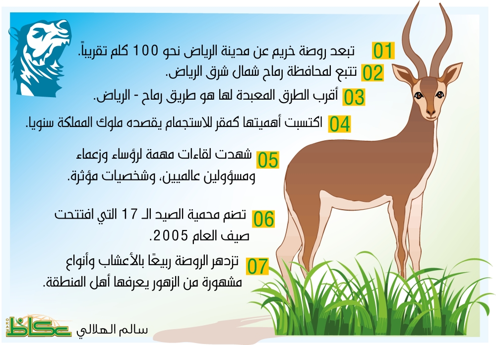 وتضم روضة خريم محمية الصيد الـ 17 في السعودية التي افتتحت صيف العام 2005، وكان حدثا مهما انضمامها إلى منظومة المحميات المعلنة بإشراف الهيئة الوطنية لحماية الحياة الفطرية وإنمائها لإطلاق الأحياء الفطرية فيها.
