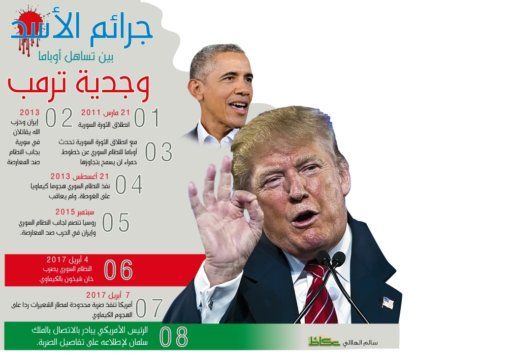 عاد النظام السوري المجرم وبعد 3 سنوات وقبل أسبوع لمحاولة أخرى من خلال ضرب السوريين في خان شيخون بغاز الخردل، وكأن أوباما لا يزال حاضراً في المشهد الأمريكي، لكن قواعد اللعبة تغيرت، فأصدر ترمب أوامره الجمعة الماضية بضرب مطار الشعيرات السوري الذي انطلقت منه القوات السورية لضرب الشعب بالكيماوي وتم تدمير المطار بالكامل.