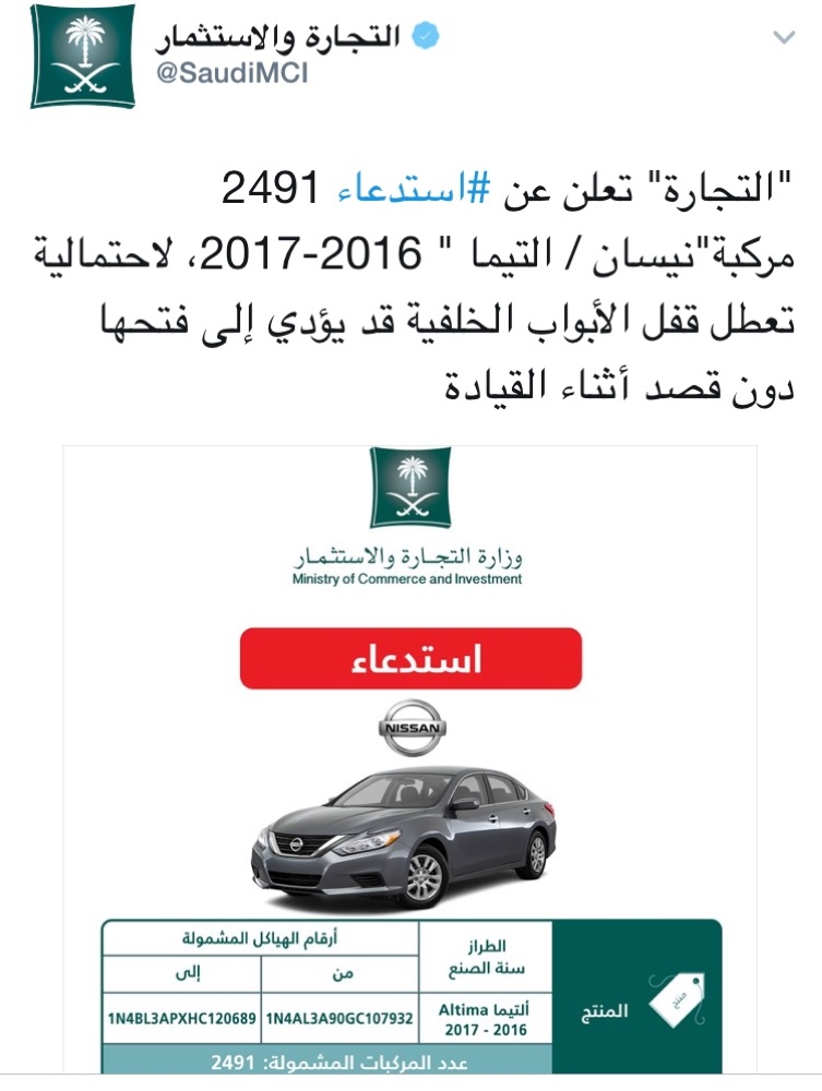 وقالت بتغريدة على حسابها الرسمي على موقع التواصل الاجتماعي "تويتر" اليوم (الأربعاء): "التجارة" تعلن عن استدعاء 2491 مركبة "نيسان / التيما" 2016 - 2017، لاحتمالية تعطل قفل الأبواب الخلفية قد يؤدي إلى فتحها دون قصد أثناء القيادة ".