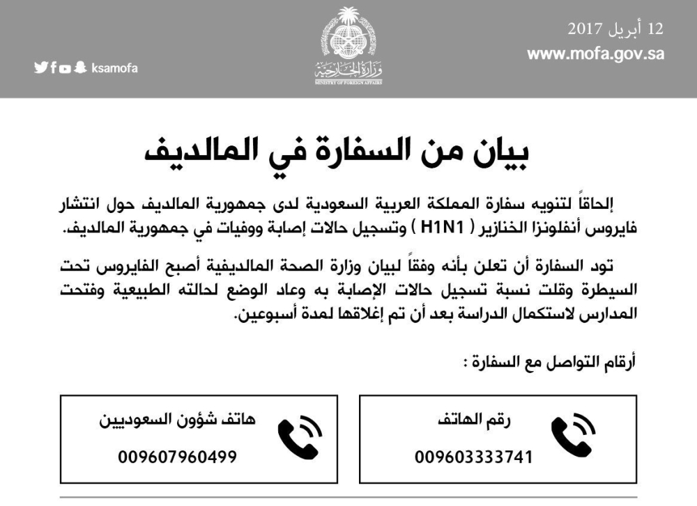 وكانت السفارة السعودية في المالديف قد حذرت قبل أسبوعين جميع المواطنين الموجودين في جمهورية المالديف من انتشار إنفلونزا الخنازير، مطالبة حينها بأخذ الحيطة والحذر نظرا لانتشار الفايروس، وعدم الوجود في الأماكن العامة المزدحمة، والحرص على استخدام الأساليب الوقائية كالكمامات والمعقمات الطبية.