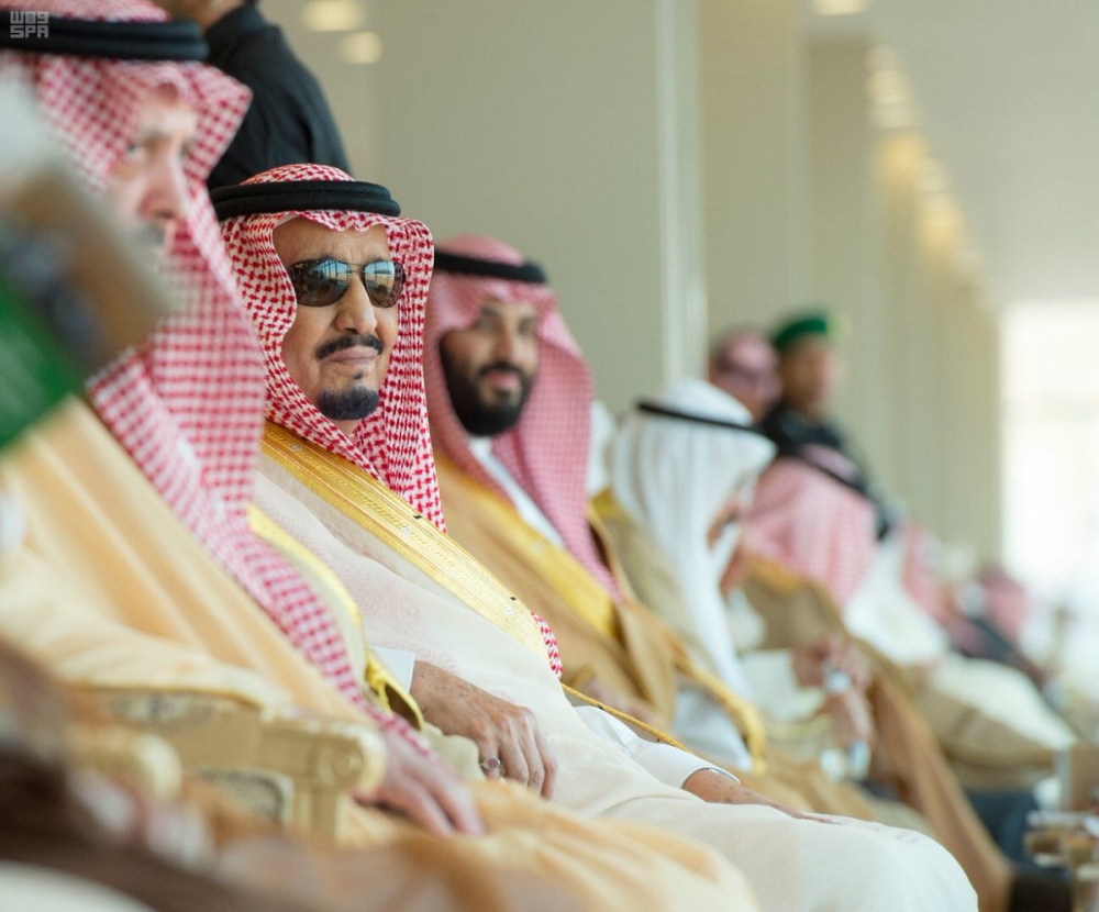 وبعد أن أخذ خادم الحرمين الشريفين وضيوفه مكانهم في المنصة الرئيسة عزف السلام الملكي.