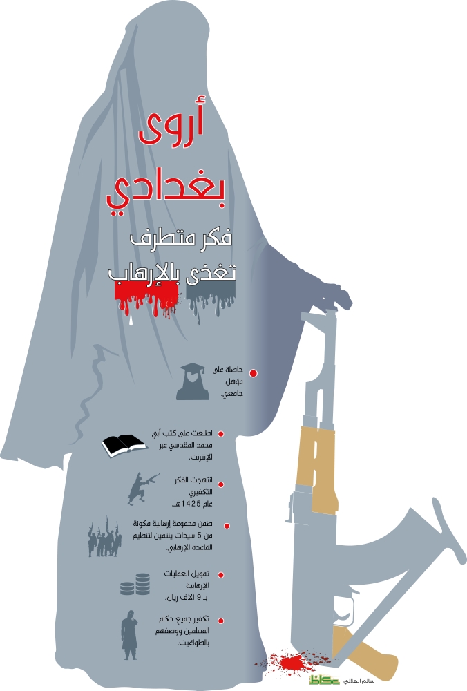تعود تفاصيل انتهاج أروى بغدادي -الحاصلة على مؤهل جامعي- للفكر التكفيري إلى عام 1425هـ بعد اطلاعها على كتب لأبي محمد المقدسي (يعتبر من أبرز منظري الفكر الإرهابي ـ أردني من أصل فلسطيني)، الذي كان من خلال تلك الكتب يكفر جميع حكام المسلمين دون استثناء ويصفهم بالطواغيت لعدم تحكيمهم لشرع الله وإقامة الحدود، إذ تولدت لديها قناعة بما يطرحه أبي محمد المقدسي، إذ كانت تحصل على تلك الكتب عن طريق تصفحها على الإنترنت، إضافة لمشاهدتها لبعض الأفلام القتالية بالعراق والشيشان وبعض الأناشيد الحماسية.