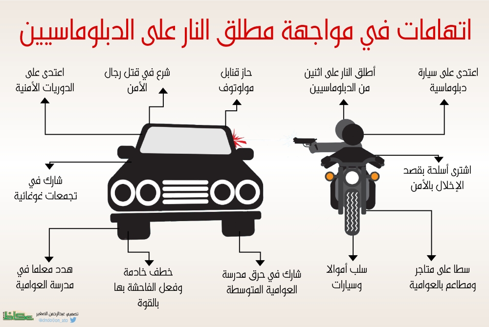 قدمت هيئة التحقيق والادعاء العام لائحة اتهام ضد ثاني المتورطين في الاعتداء المسلح على سيارة دبلوماسية تابعة للسفارة الألمانية بالسعودية كان يستقلها دبلوماسيان ألمانيان يوم الإثنين 12 ربيع الأول 1435هـ. وقدم المدعي العام خلال الجلسة التي عقدت أمس (الإثنين) بالمحكمة الجزائية المتخصصة بالرياض لائحة من 10 تهم ضد المدعى عليه، منها الاعتداء على سيارة الدبلوماسيين الألمان بإغلاق طريقها بإطارات وحرقها ثم مطاردتها وإطلاق النار عليها من سلاح رشاش، ومشاركته في إطلاق النار مع عدد من الأشخاص ما تسبب في احتراق السيارة، والاشتراك في عملية حرق مدرسة العوامية المتوسطة.