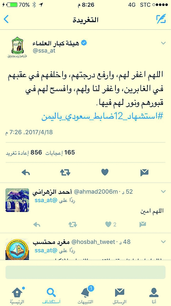 « إذا مات منا سيد قام سيد»، كان هذا لسان حال المغردين وهم يتابعون هاشتاق «#استشهاد_12_ضابط_سعودي_باليمن»، بعد أن هبوا ملبين نداء إخوتهم في يمن العروبة لمواجهة الملالي، الذين اتخذوا من الحوثي وصالح مطايا لاحتلال يمن العروبة والشرف ووضعه تحت إبط ملالي فارس.