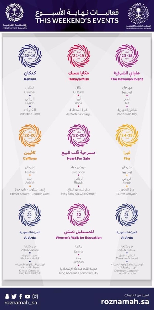 تقدم هيئة الترفيه خلال عطلة نهاية الأسبوع مجموعة من الفعاليات الثقافية والفنية والرياضية الملهمة في العديد من مدن المملكة والموجهة لمختلف شرائح المجتمع، والتي تهدف لقضاء عطلة نهاية أسبوع مليئة بالسعادة في جو أسري ممتع.