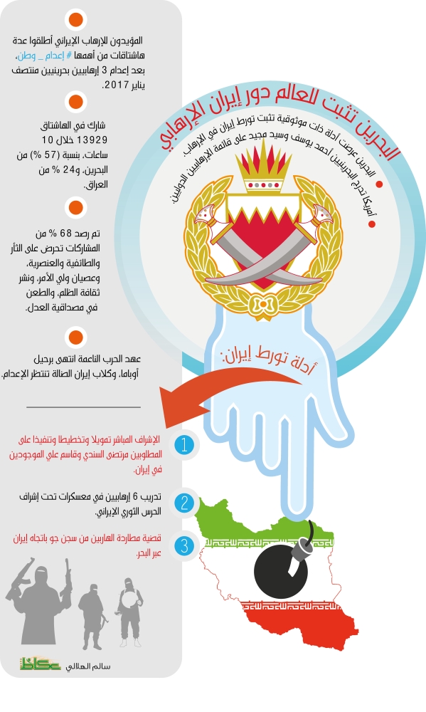 ها هي مملكة البحرين، مملكة الأمن والأمان، تسير على النهج السعودي الحازم والأنموذج الدولي في مكافحة الإرهاب، وتقدم عاماً نموذجياً في مكافحة الإرهاب الإيراني. وتعرض أدلة ذات موثوقية ومصداقية لتثبت للعالم ارتباط إيران والحرس الثوري الإيراني بدعم وإدارة الإرهاب، وزعزعة الأمن والسلم الدوليين.