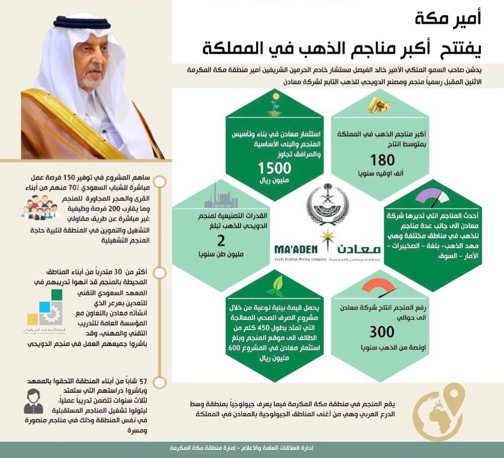 يدشن مستشار خادم الحرمين الشريفين، أمير منطقة مكة المكرمة الأمير خالد الفيصل يوم غد (الاثنين)، رسمياً منجم ومصنع الدويحي للذهب التابع لشركة معادن ومشاريع البنية الأساسية للتعدين في المنطقة.