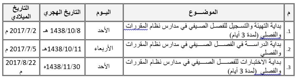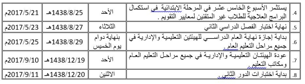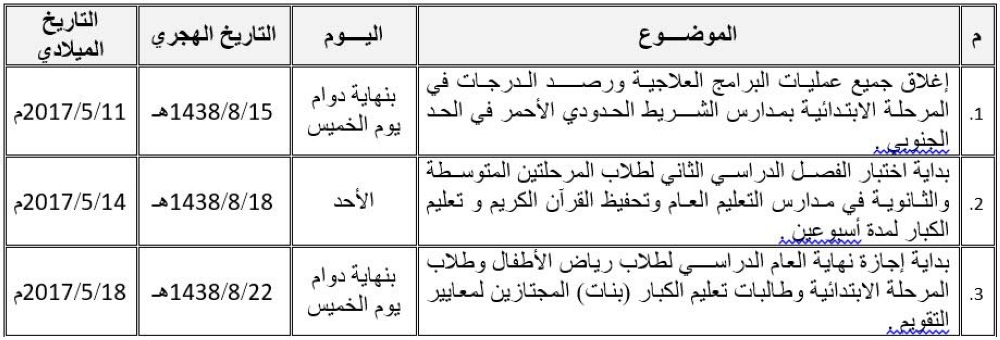 أصدر وزير التعليم الدكتور أحمد بن محمد العيسى تعميماً لجميع قطاعات الوزارة وإدارات التعليم بمناطق ومحافظات المملكة بشأن تنفيذ التوجيه السامي الكريم بأن تكون نهاية اختبارات الفصل الدراسي الحالي قبل بداية شهر رمضان المبارك، وتضمن توجيه العيسى اعتماد التقويم الدراسي الجديد لبقية العام الدراسي 1438/1437هـ، والتأكيد على كافة المعلمين والمعلمات باستيفاء كافة مفردات المقرر في الخطة الدراسية قبل بداية الاختبارات، مع إضافة حصة دراسية واحدة يومياً لجميع المراحل مدتها ( 45 ) دقيقة لضمان إنهاء المقررات