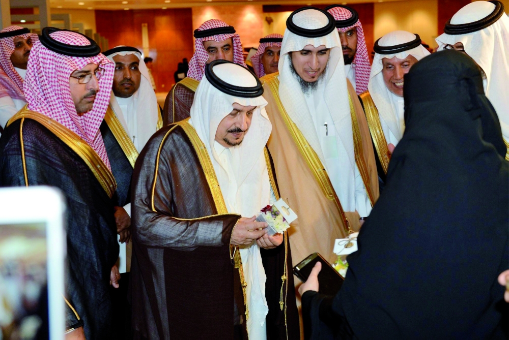 الأمير فيصل بن بندر متفقدا المعرض المصاحب للملتقى. (عكاظ)