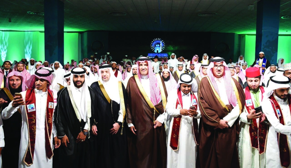 أمير المدينة ونائبه يتوسطان خريجي الجامعة الإسلامية.