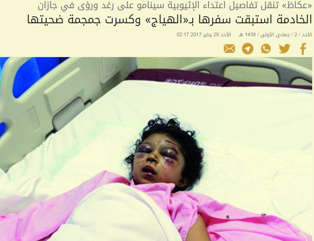 قضت محكمة جازان أمس الأول (الثلاثاء) بالسجن 14 عاما و1300 جلدة على الخادمة الإثيوبية سينامو، التي اعتدت بالضرب والوحشية على الطفلتين رغد (9 أعوام) ورؤى محمد سعيد عزيزي (7 أعوام)، وأمهما الحامل، في قرية صنبة بجازان قبل عدة أشهر (يناير الماضي2017).