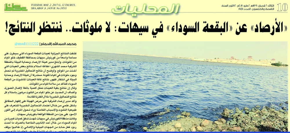 وكان مدير هيئة الأرصاد وحماية البيئة بالمنطقة الشرقية محمد الشهري أبلغ «عكاظ» الإثنين الماضي تسلم نتائج بعض العينات التي أخذت من الموقع ولم تحمل وجود ملوثات في المياه الملونة، لافتا إلى أنهم في انتظار ظهور نتائج كافة العينات المأخوذة من البقعة السوداء للتأكد من سلامة المياه من الملوثات، وقال «الحديث عن خلو المياه من التلوث مرهون باستلام كل نتائج التحاليل المخبرية خلال الفترة القادمة».
