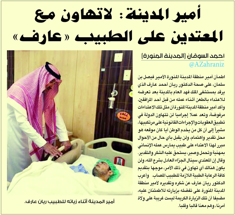 وأعرب الدكتور ريان الذي تعرض إلى اعتداء من مواطن في مستشفى الملك فهد بالمدينة المنورة، لـ«عكاظ» عن سعادته البالغة بزيارة الأمير فيصل بن سلمان، وما قدّمه له من دعم، كما أعرب عن ارتياحه للاتصال الهاتفي من وزير الصحة الذي جدد عزم الوزارة على عدم السماح بتكرار مثل هذه الحوادث على أي من الكوادر الطبية العاملة في السعودية.