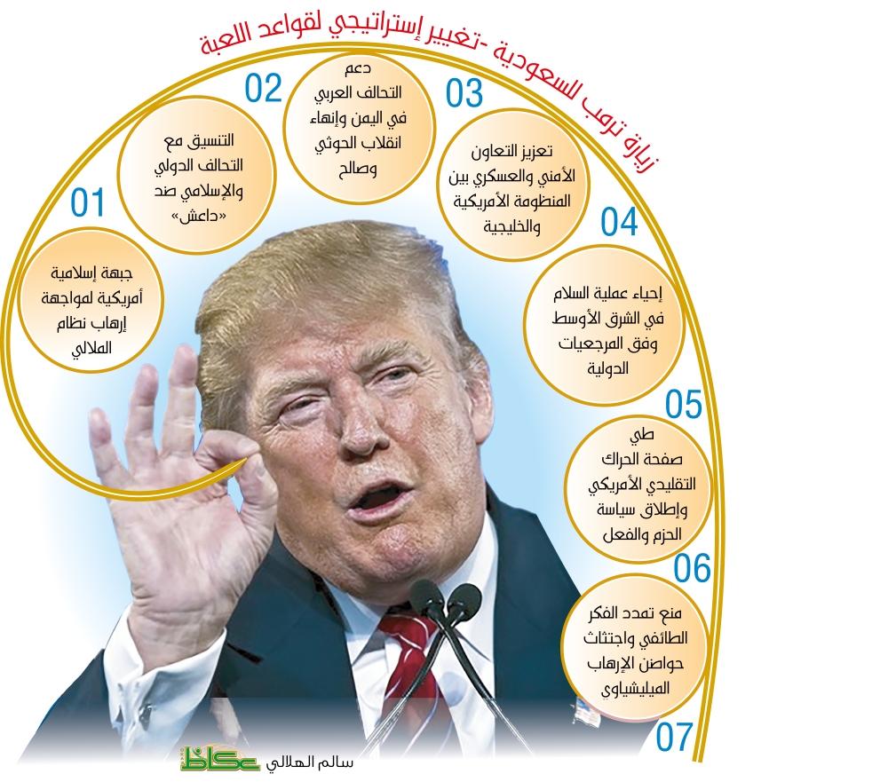 زيارة ترمب ستعمل على إيجاد حل طويل الأمد للإرهاب، ومواجهة إيران وداعش، وزيادة التعاون الأمني مع دول الشرق الأوسط، وستؤكد النهج الجديد للإدارة الأمريكية في طي صفحة الإدارة السابقة ورسم ملامح مرحلة جديدة لمواجهة التطرّف الذي زعزع استقرار المنطقة والعالم.