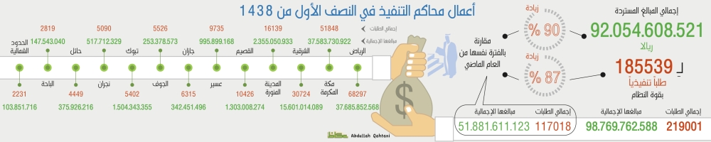 أعلنت وزارة العدل أن محاكم التنفيذ بمختلف المناطق استردّت 92.054.608.521 ريالا لـ 185.539 طلباً تنفيذياً بقوّة النظام خلال النصف الأول من العام الحالي 1438هـ، بزيادة مقدارها 87% لطلبات التنفيذ و90% للمبالغ، مقارنة بالفترة نفسها من العام الماضي 1437هـ.