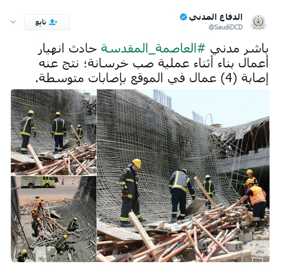 باشرت فرق الدفاع المدني اليوم (الأربعاء) في العاصمة المقدسة إنهيار خرسانة في أحد المواقع نتج عنها إصابة أربعة عمال بإصابات مختلفة. وقال الدفاع المدني على موقعه في "تويتر" تعرض أربعة عمال بإصابات متوسطة.