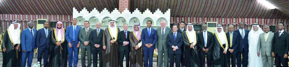 سفراء ورؤساء البعثات الدبلوماسية في صورة جماعية مع أعضاء لجنة الصداقة البرلمانية في «الشورى» أمس. (واس)