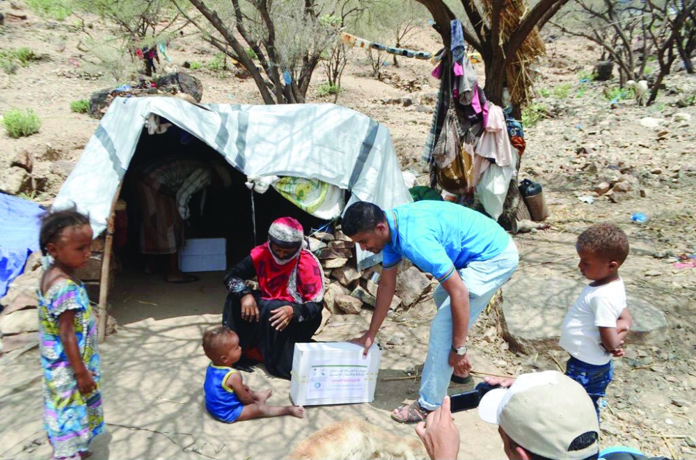 عضو فريق مركز الملك سلمان أثناء تسليم التمور لإحدى الأسر في المخا أمس. (واس)