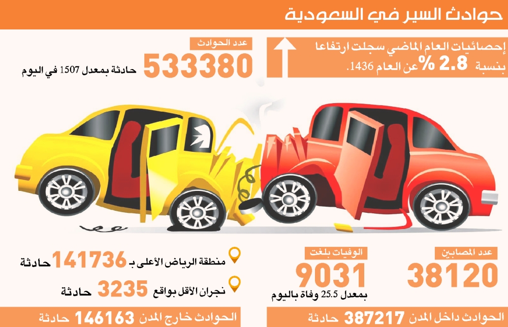 وكانت الإحصاءات الأخيرة للعام الماضي سجلت ارتفاعا في الحوادث المرورية بالمملكة بنسبة 2.8% على إحصاء عام 1436. ووفقاً للإحصاء الذي أعلنته هيئة الإحصاء العامة في مؤشرها الذي أصدرته مطلع الأسبوع الماضي، بلغ عدد الحوادث المرورية بالسعودية 533380 حادثة بمعدل 1507 حوادث في اليوم، فيما بلغ عدد المصابين 38120 مصاباً، أما الوفيات فقد بلغت 9031 وفاة بمعدل 25.5 وفاة في اليوم.