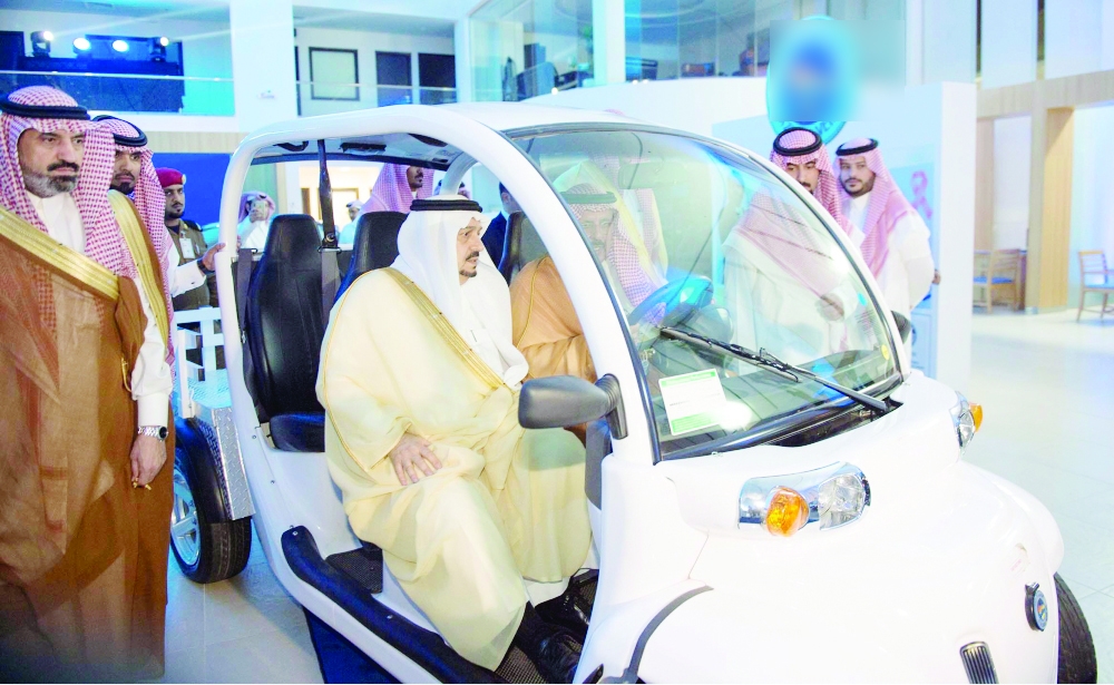 الأمير فيصل بن بندر متجولا في صالة عرض السيارات. (واس)