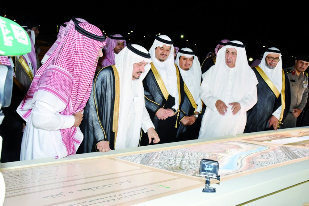الأمير فيصل بن بندر يطلع على خريطة أحد المشاريع. (عكاظ)