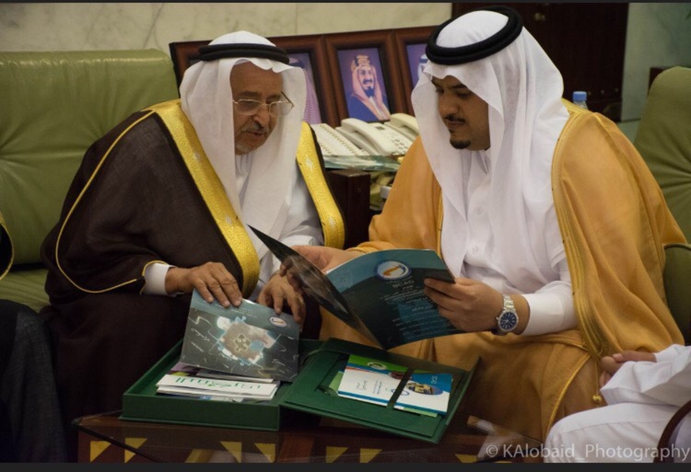 الأمير محمد بن عبدالرحمن متصفحا مجلدا عن أنشطة الجمعية. (عكاظ)