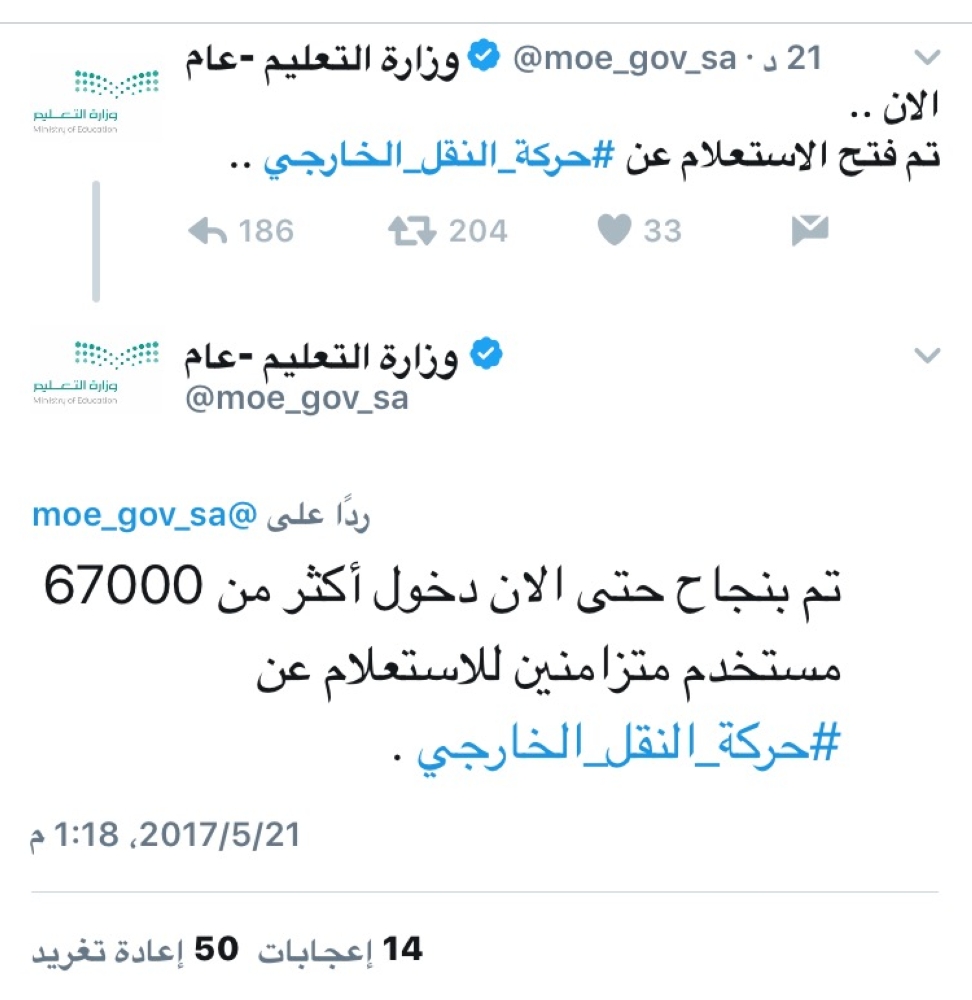 وقالت الوزارة على حسابها الرسمي على "تويتر" اليوم (الاحد): الأن .. تم فتح الاستعلام عن #حركة_النقل_الخارجي. وأضافت الوزارة تم بنجاح حتى الآن دخول أكثر من 67000 مستخدم متزامنين للاستعلام عن #حركة_النقل_الخارجي.