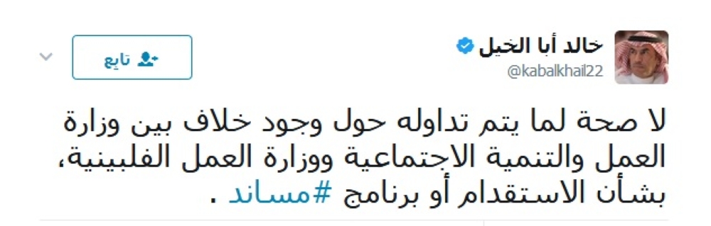 وقال خالد أبا الخيل المتحدث باسم وزارة العمل والتنمية الاجتماعية عبر حسابه بـ "تويتر": "لا صحة لما يتم تداوله حول وجود خلاف بين وزارة العمل والتنمية الاجتماعية ووزارة العمل الفلبينية، بشأن الاستقدام أو برنامج مساند.