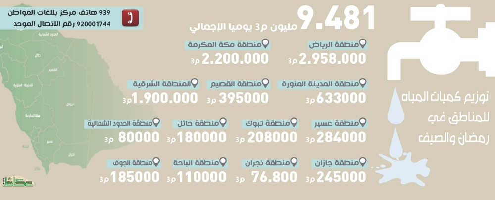 أعلن قطاع توزيع خدمات المياه في السعودية المتمثل في إدارات خدمات المياه بالمناطق وشركة المياه الوطنية أنه سيضخ 9،481 مليون متر مكعب يومياً في جميع المدن في إطار استعداداته لموسمي شهر رمضان المبارك والصيف، بهدف توفير أكبر كمية من المياه لأهالي وزوار المناطق خلال تلك الفترة التي تشهد عادة ارتفاعاً ملموساً في الطلب على المياه.