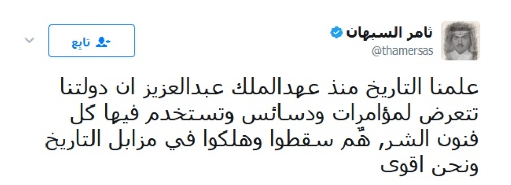 وجاء حديث السبهان جراء ما تتعرض المملكة لهجمة شعواء من قبل السياسة القطرية لا تنم عن حسن النوايا، إذ غرد السبهان، عبر حسابه بـ"تويتر": علمنا التاريخ منذ عهد الملك عبدالعزيز أن دولتنا تتعرض لمؤامرات ودسائس وتستخدم فيها كل فنون الشر، هم سقطوا وهلكوا في مزابل التاريخ ونحن أقوى.