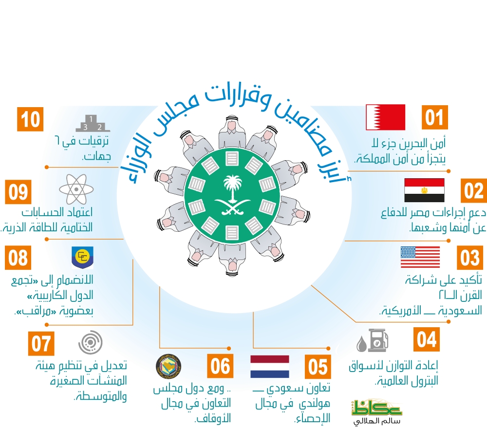 ووفقا لوزير الثقافة والإعلام الدكتور عواد بن صالح العواد فقد اتخذ مجلس الوزراء بعد الاطلاع على الموضوعات المدرجة على جدول أعمال جلسته، عددا من القرارات تضمنت: تفويض وزير الاقتصاد والتخطيط -أو من ينيبه- بالتباحث مع الجانب الهولندي في شأن مشروع مذكرة تفاهم بين حكومة المملكة العربية السعودية وحكومة مملكة هولندا للتعاون في مجال الإحصاء، والتوقيع عليه، ومن ثم رفع النسخة النهائية الموقعة، لاستكمال الإجراءات النظامية. وتفويض وزير العمل والتنمية الاجتماعية رئيس مجلس إدارة الهيئة العامة للأوقاف -أو من ينيبه- بالتباحث -في إطار اللجنة الدائمة للشؤون الإسلامية والأوقاف بدول مجلس التعاون لدول الخليج العربية- حول مشروع مذكرة تفاهم بين وزارات وهيئات الأوقاف والشؤون الإسلامية والدينية بدول مجلس التعاون لدول الخليج العربية في مجال الأوقاف، والتوقيع عليه ومن ثم رفع النسخة النهائية الموقعة لاستكمال الإجراءات النظامية. وأقر المجلس تعديل الفقرة (3) من المادة (الخامسة) من تنظيم الهيئة العامة للمنشآت الصغيرة والمتوسطة، الصادر بقرار مجلس الوزراء رقم (301) وتاريخ 11/ 7/ 1437، لتكون بالنص الآتي: «إصدار اللوائح الإدارية والمالية التي تسير عليها الهيئة -بالتنسيق مع وزارة المالية ووزارة الخدمة المدنية- وغيرها من اللوائح الداخلية»،