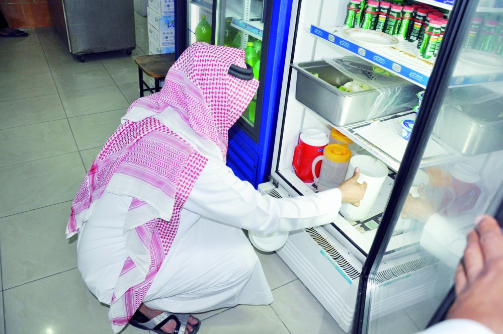 موظف بلدية تاروت خلال تفقد المواد الغذائية بأحد المحلات. (عكاظ)