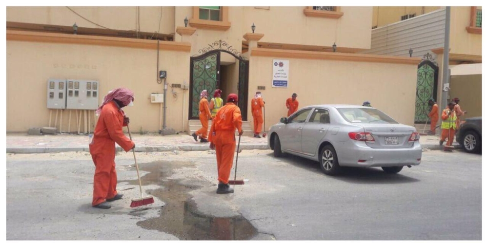 عمال نظافة خلال أداء أعمالهم بأحد الأحياء في الجبيل. (عكاظ)