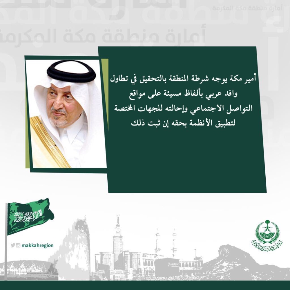 وجّه مستشار خادم الحرمين الشريفين أمير منطقة مكة المكرمة الأمير خالد الفيصل، شرطة المنطقة بالتحقيق في تطاول وافد عربي بألفاظ مسيئة على مواقع التواصل الاجتماعي.