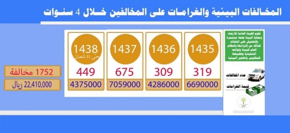 وبين التقرير أن إجمالي عدد المخالفات خلال الفترة 1429-1438هـ بلغ (2138) مخالفة وبقيمة إجمالية تجاوزت 30 مليون ريال، سجل العام 1437هـ العدد الأعلى من حيث المخالفات البيئية بواقع (675) مخالفة وبقيمة إجمالية تجاوزت 7 ملايين ريال.