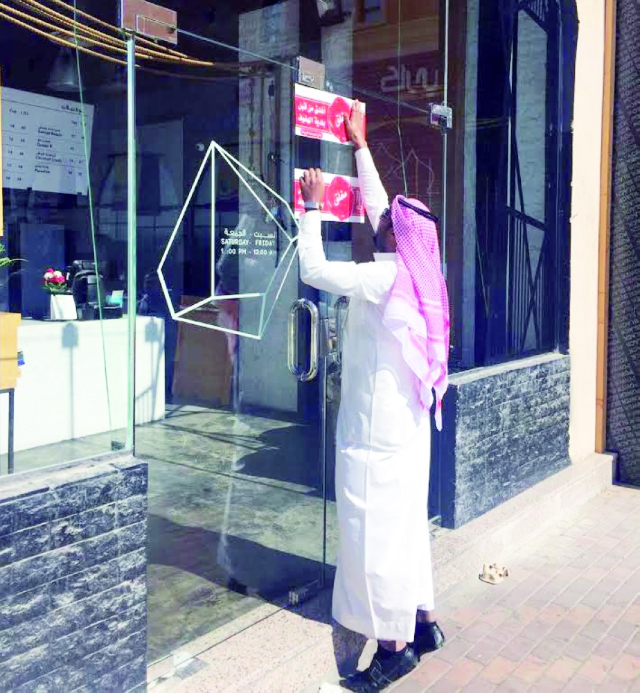 موظف الأمانة يغلق أحد المحلات المخالفة. (عكاظ)