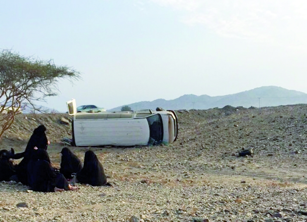 معلمات يجلسن في العراء بعد انقلاب مركبتهن على طريق الليث خلال ذهابهن لمدرستهن في قرية بجالة منتصف شعبان الماضي. (عكاظ)