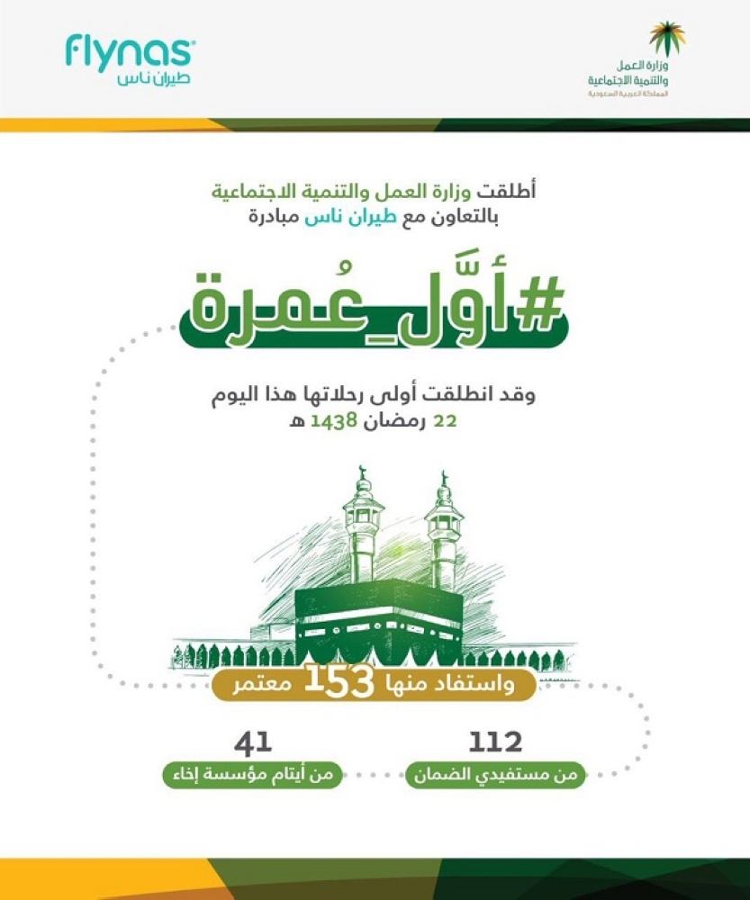 وكشفت الوزارة عبر حسابها في موقع "تويتر" أنها أطلقت المبادرة بالتعاون مع "طيران ناس"، إذ انطلقت أولى الرحلات أمس (السبت) 22 رمضان 1438هـ، مبينة أن من استهدفتهم المبادرة 112 من مستفيدي الضمان، و41 من أيتام مؤسسة "إخاء".